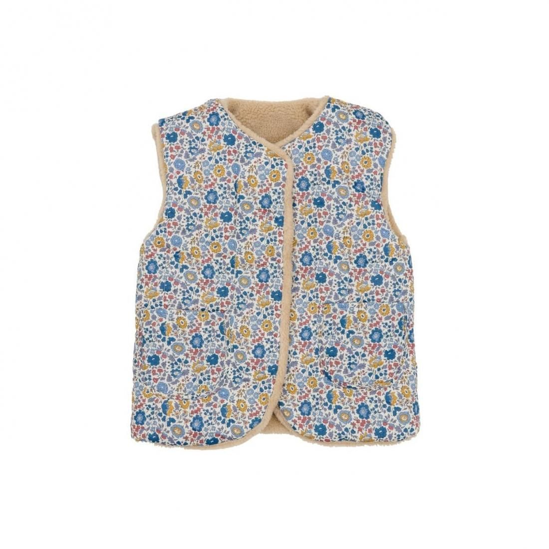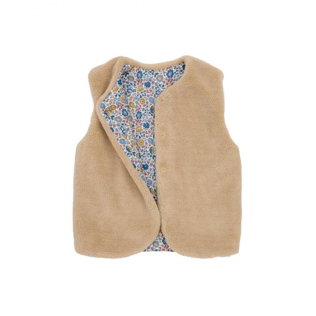 リバティダンジョとふわふわのフェイクファーを使ったとってもおしゃれなテディベスト。暖かく軽い使い勝手の良いベスト。